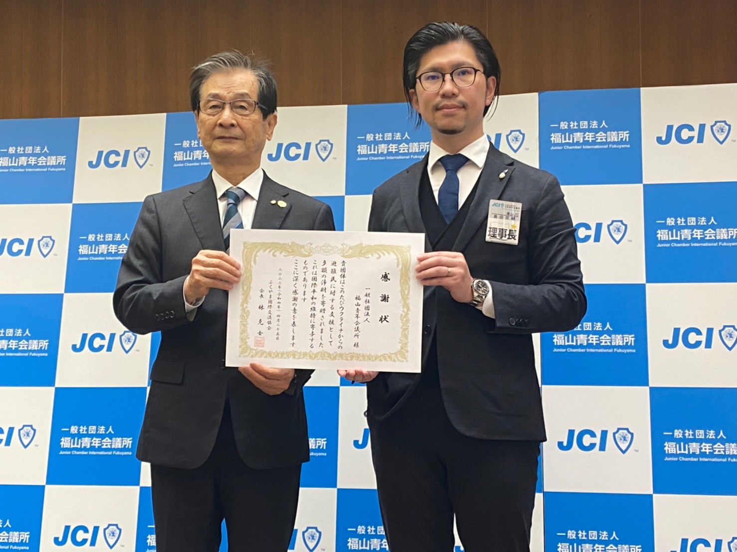 福山商工会議所で行われた贈呈式では、島田理事長からふくやま国際交流協会会長の林克士様へ目録を贈呈し、お礼として感謝状を頂戴しました。