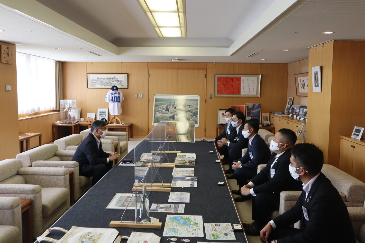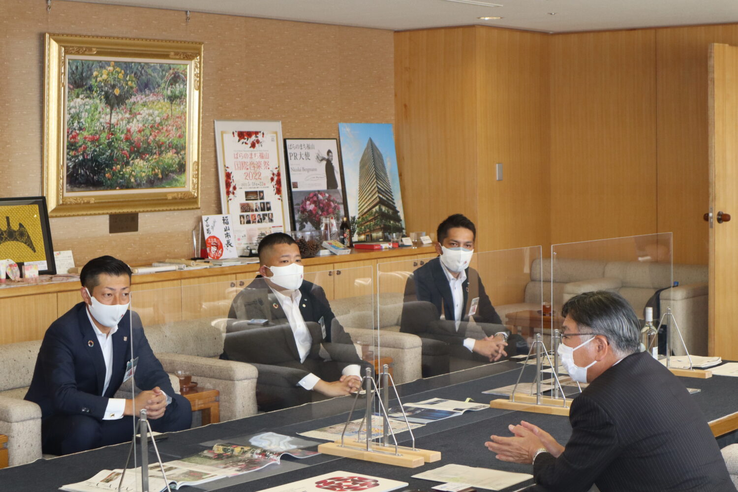 成功祈願の後、福山市長へ表敬訪問を行い、全国城下町青年会議所連絡協議会山本会長、米田直前会長、松浦副会長(次年度開催予定地島原青年会議所)、島田理事長、徳岡実行委員長のメンバーでご挨拶に伺いました