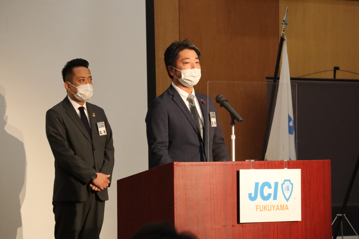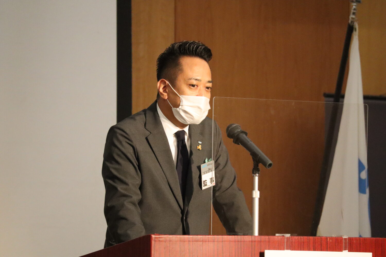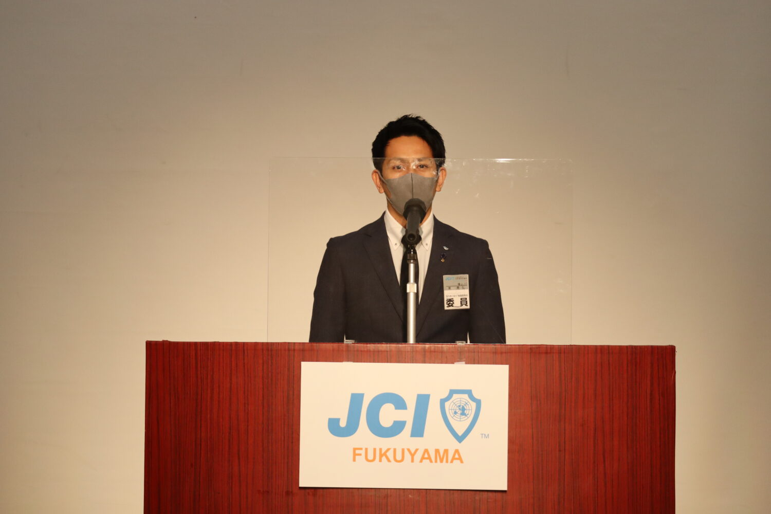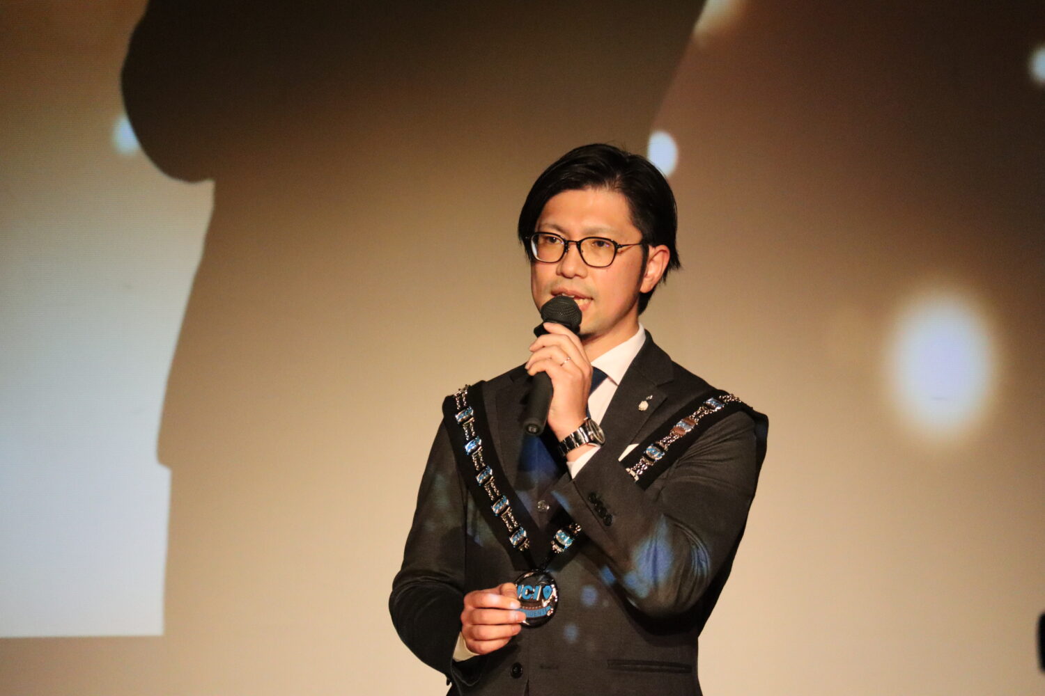 3分間スピーチは2023年度理事予定者の東晃弘君が担当し、入会から来年度理事に挑戦するまでの経験や第41回全国城下町シンポジウム福山大会で総括副実行委員長を務めた経験について話されました。