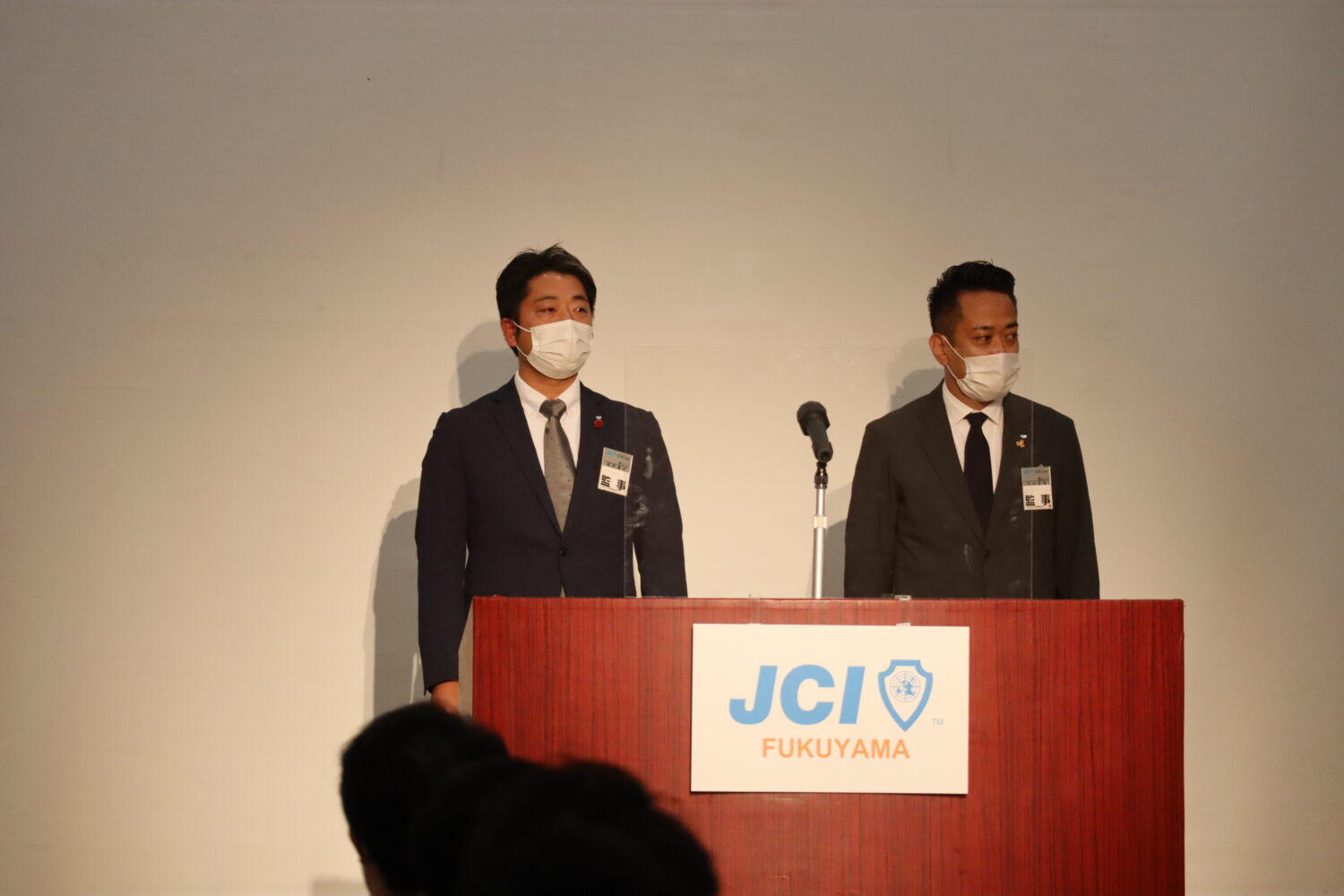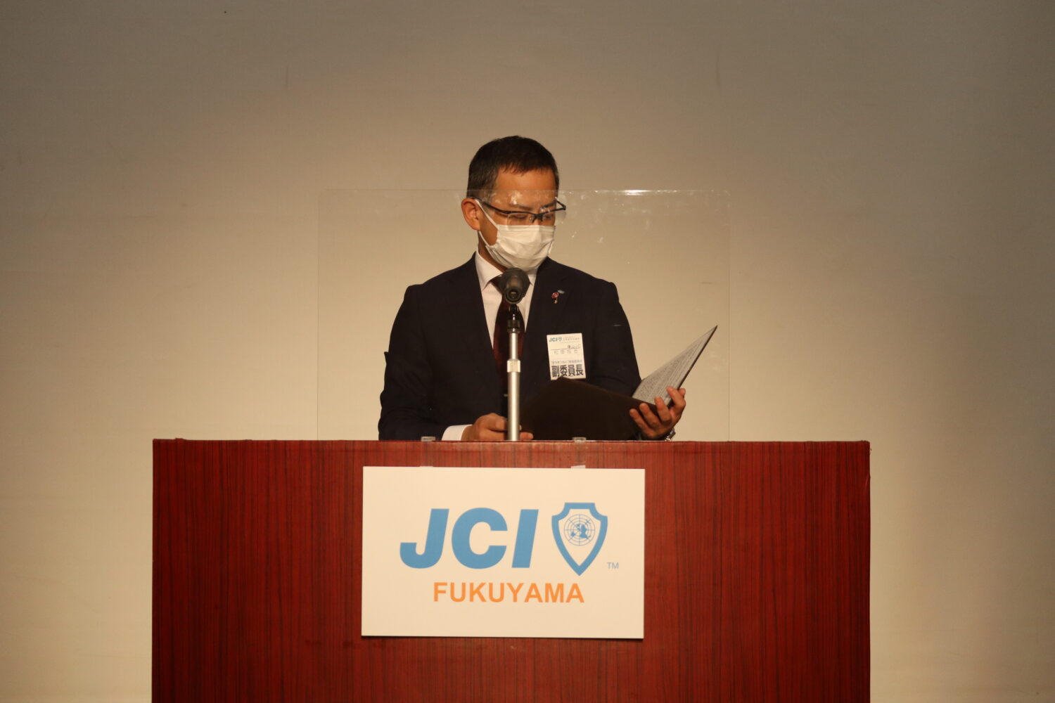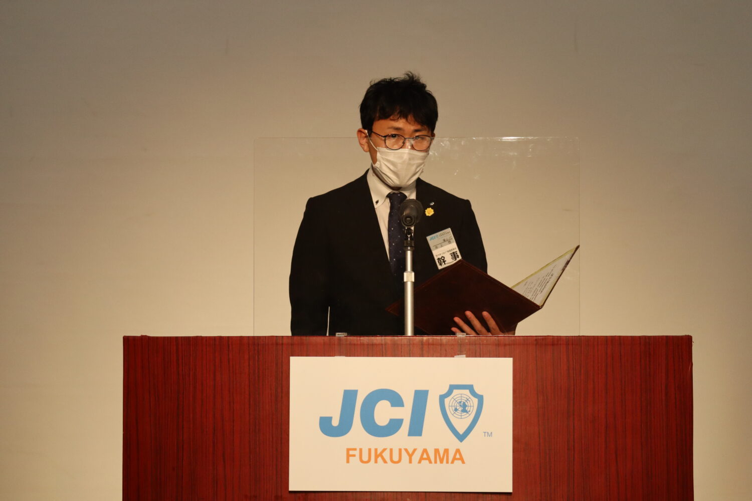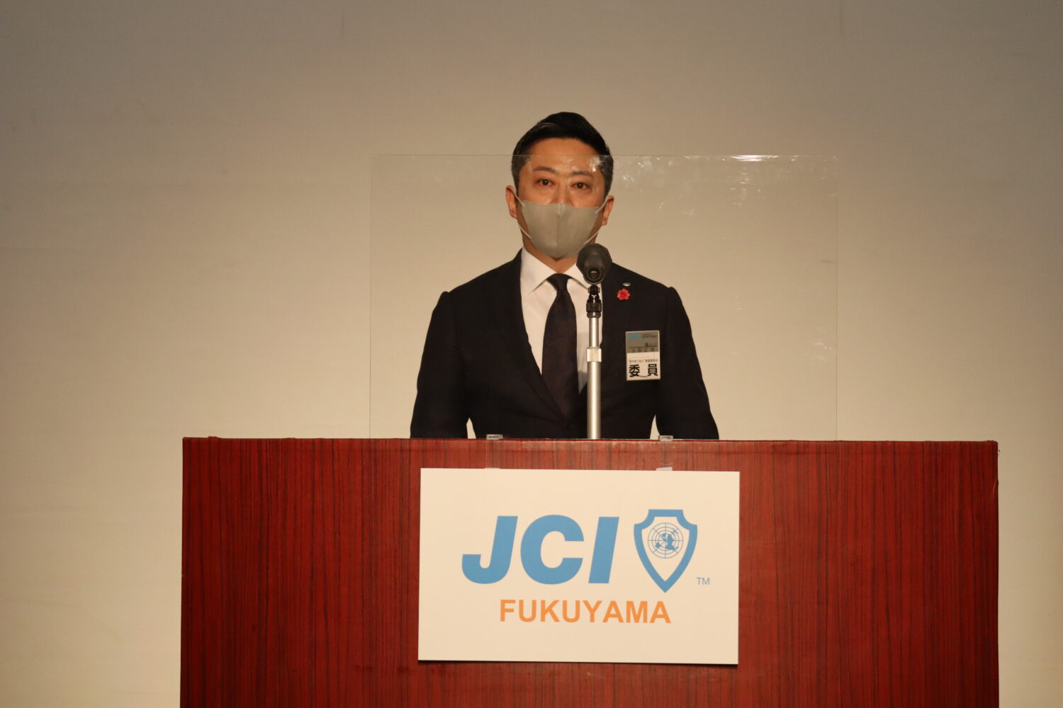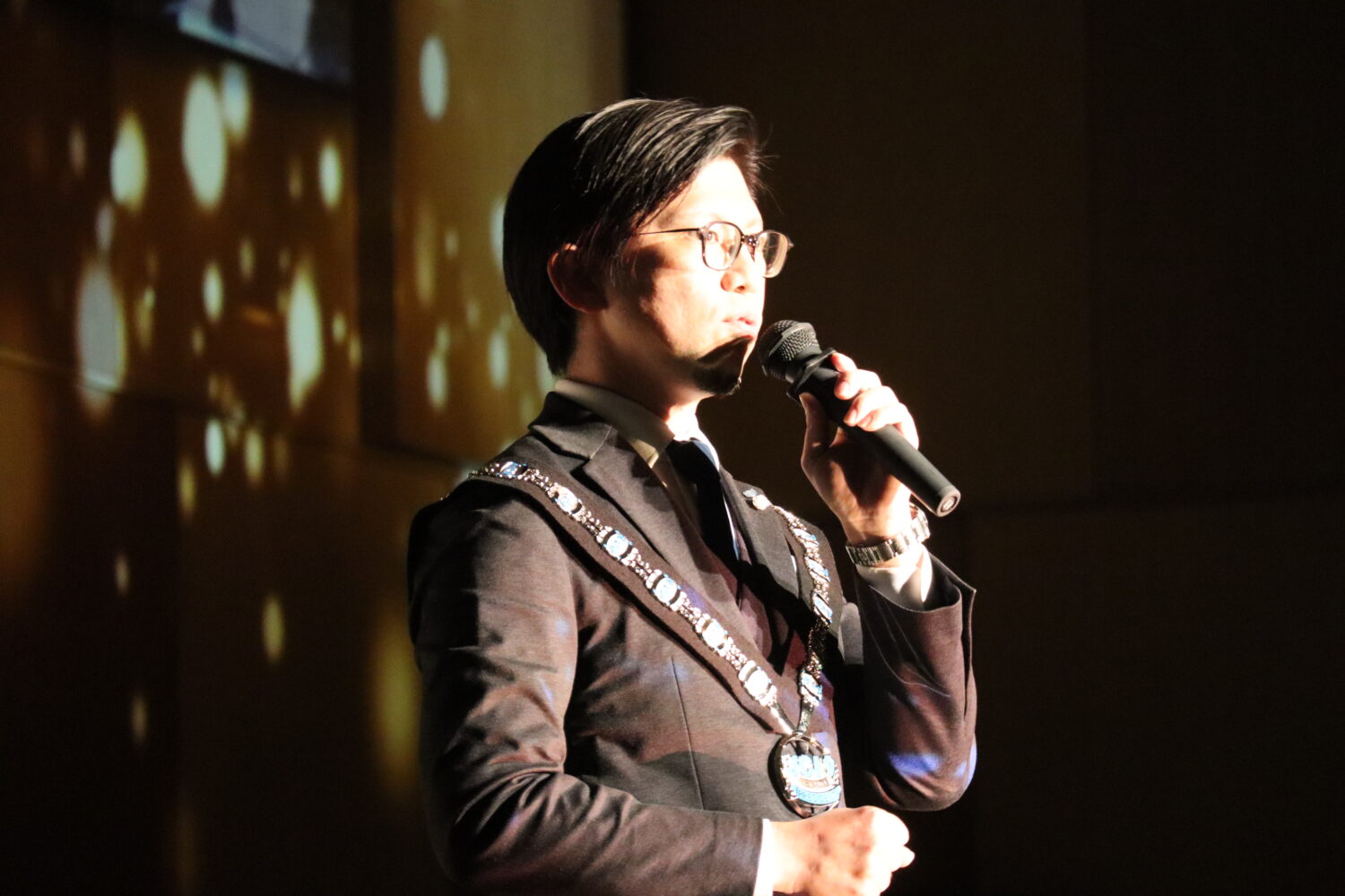 3分間スピーチは2023年度理事予定者の東晃弘君が担当し、入会から来年度理事に挑戦するまでの経験や第41回全国城下町シンポジウム福山大会で総括副実行委員長を務めた経験について話されました。