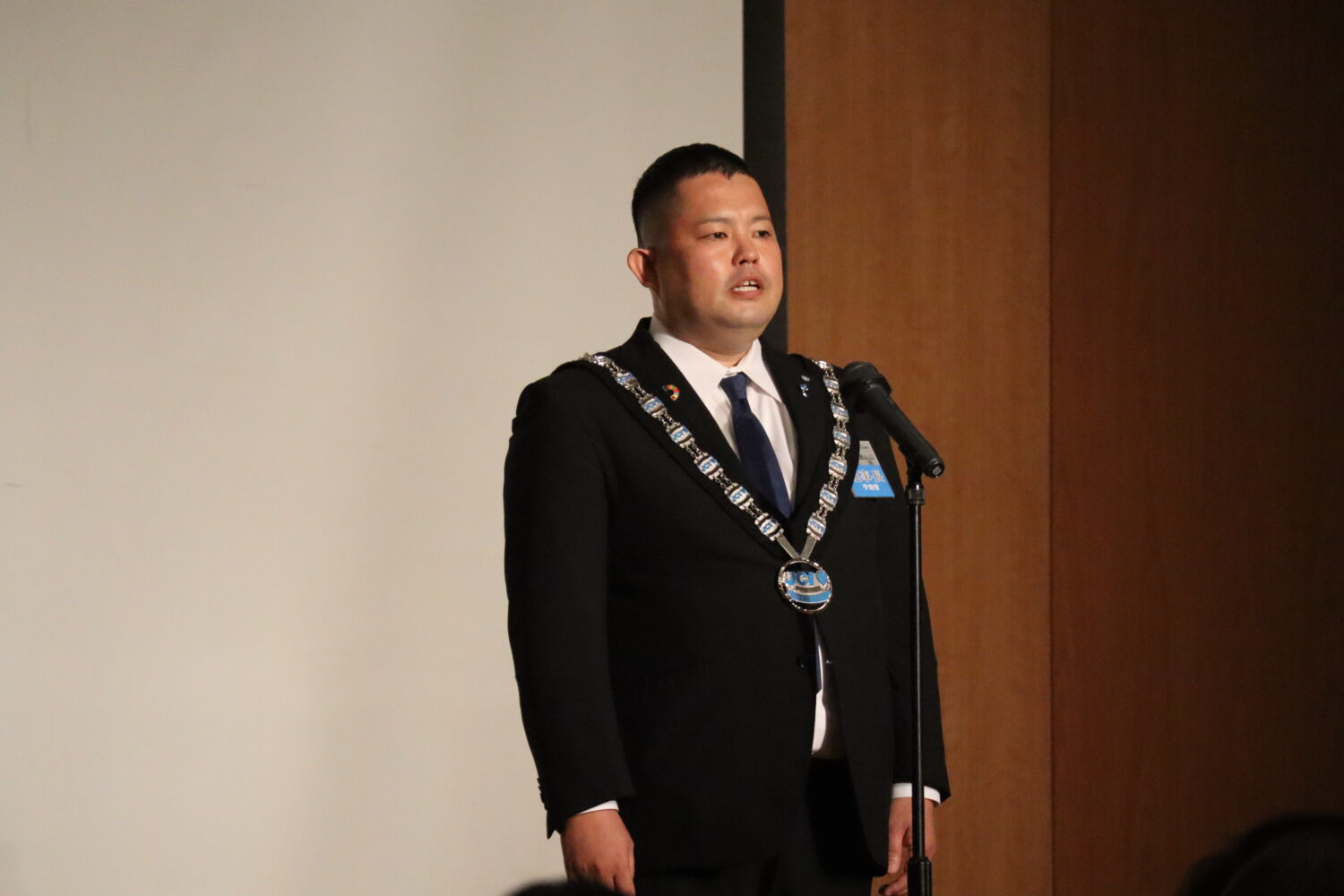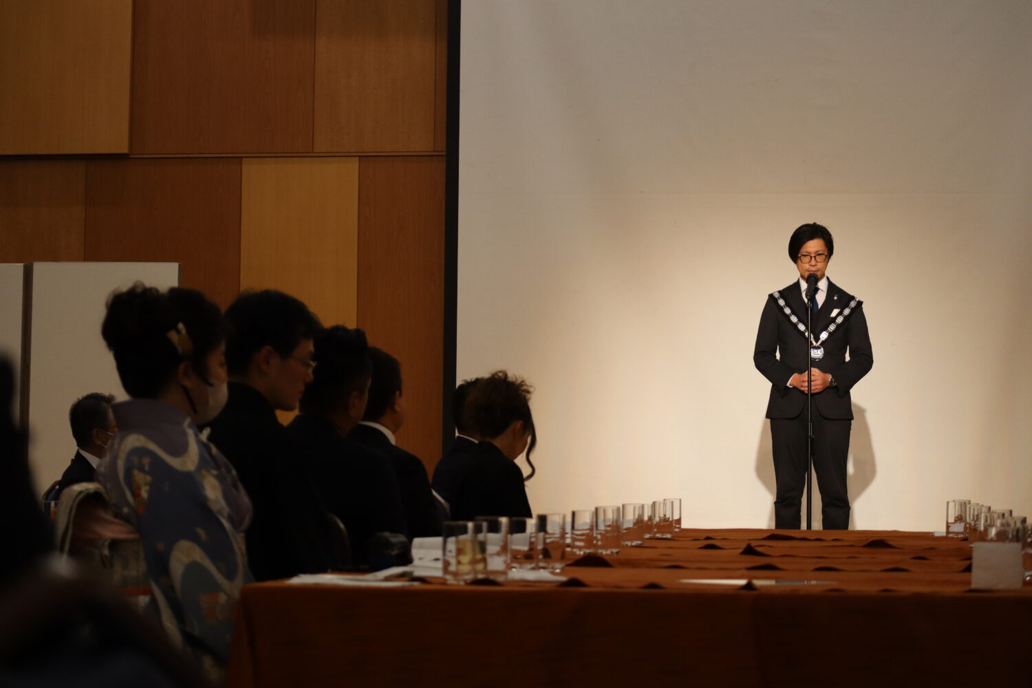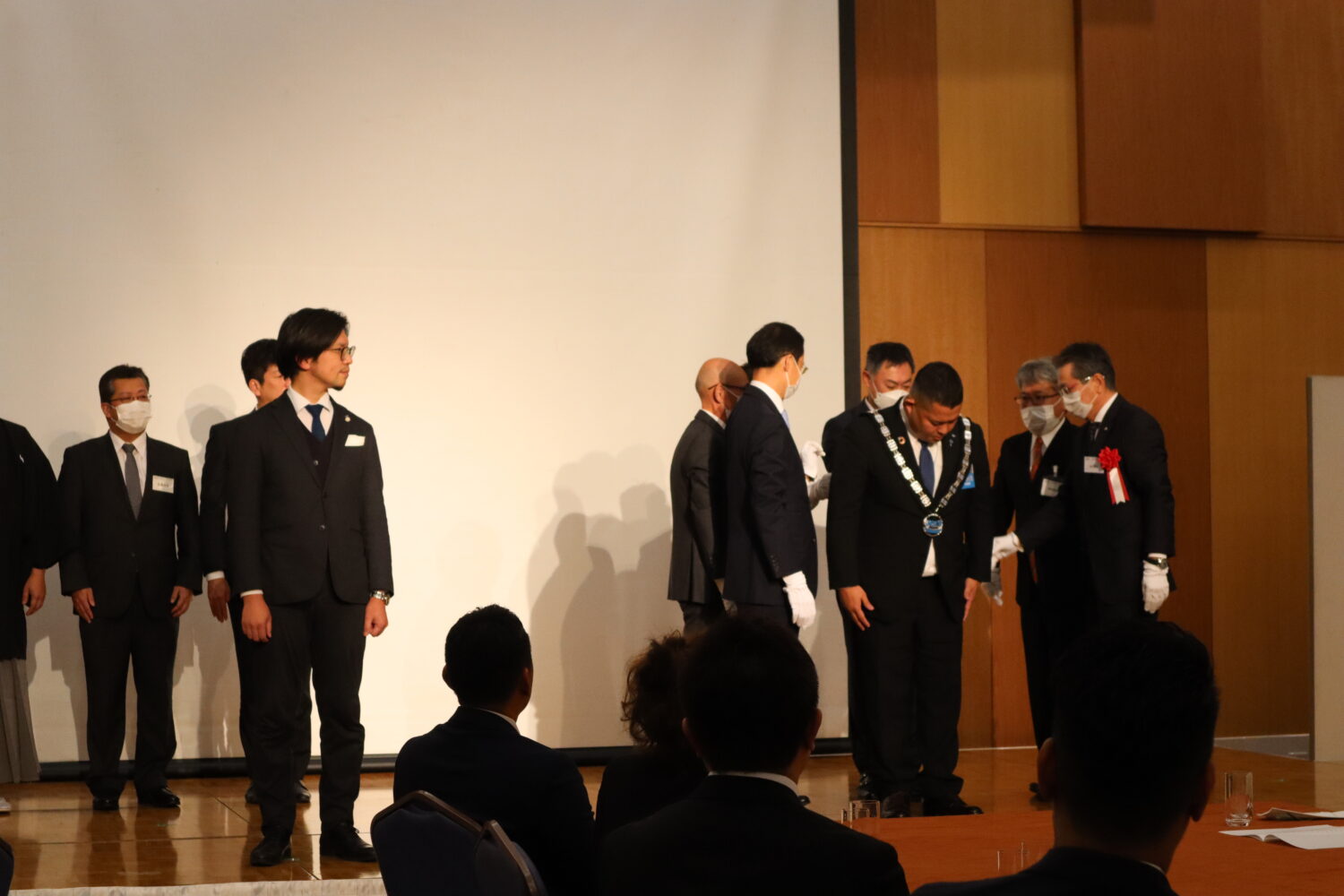 プレジデンシャルリリースの伝達式が行われ、歴代理事長の皆様に介添えを頂き、当年度理事長、島田宗輔君より2023年度理事長予定者の徳岡旭君へプレジデンシャルリリースの伝達が行われました。