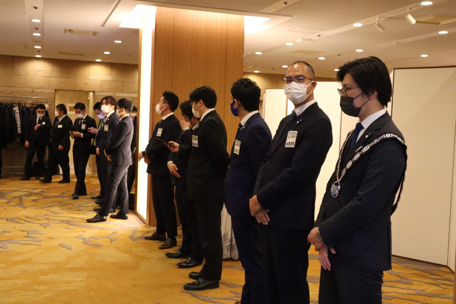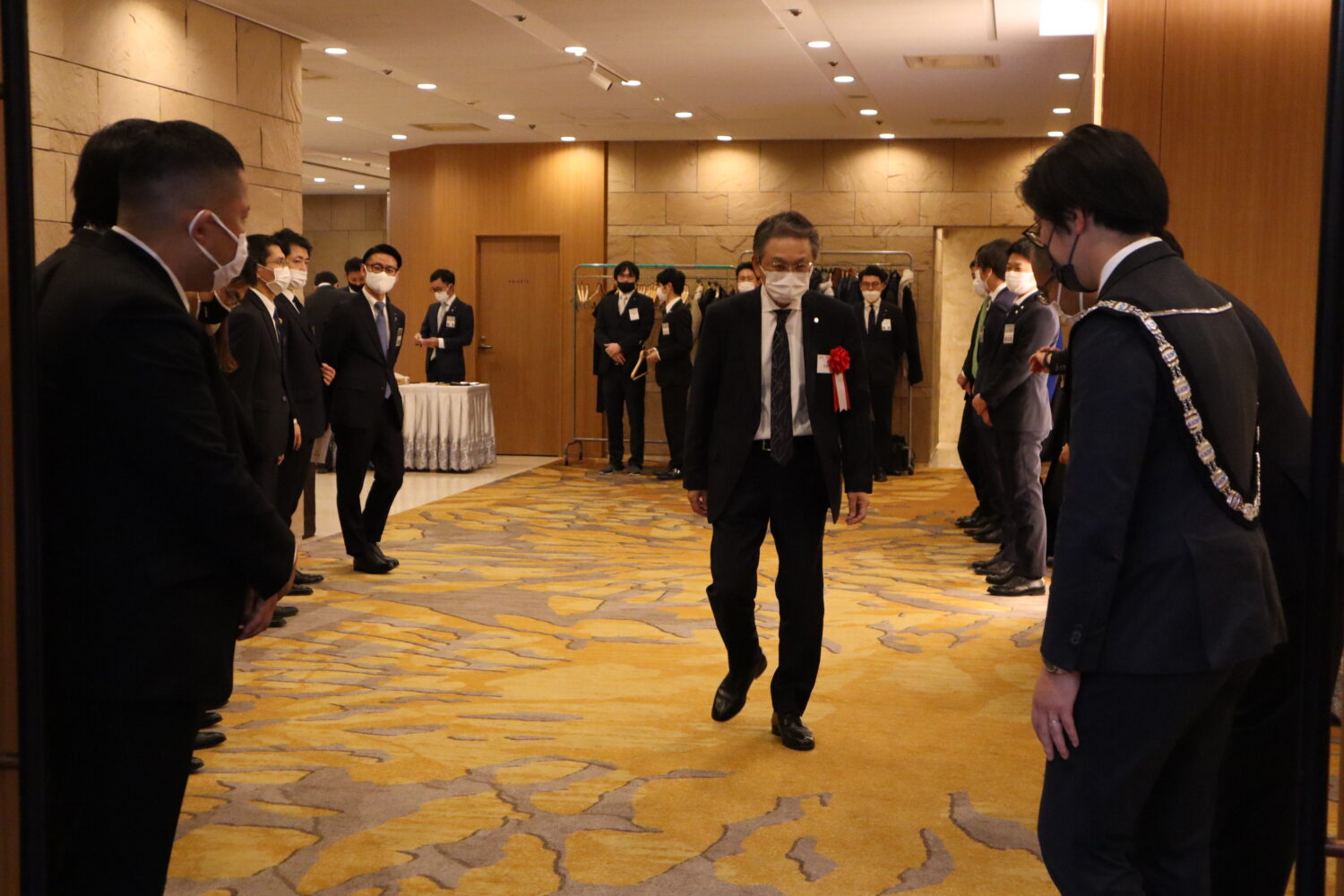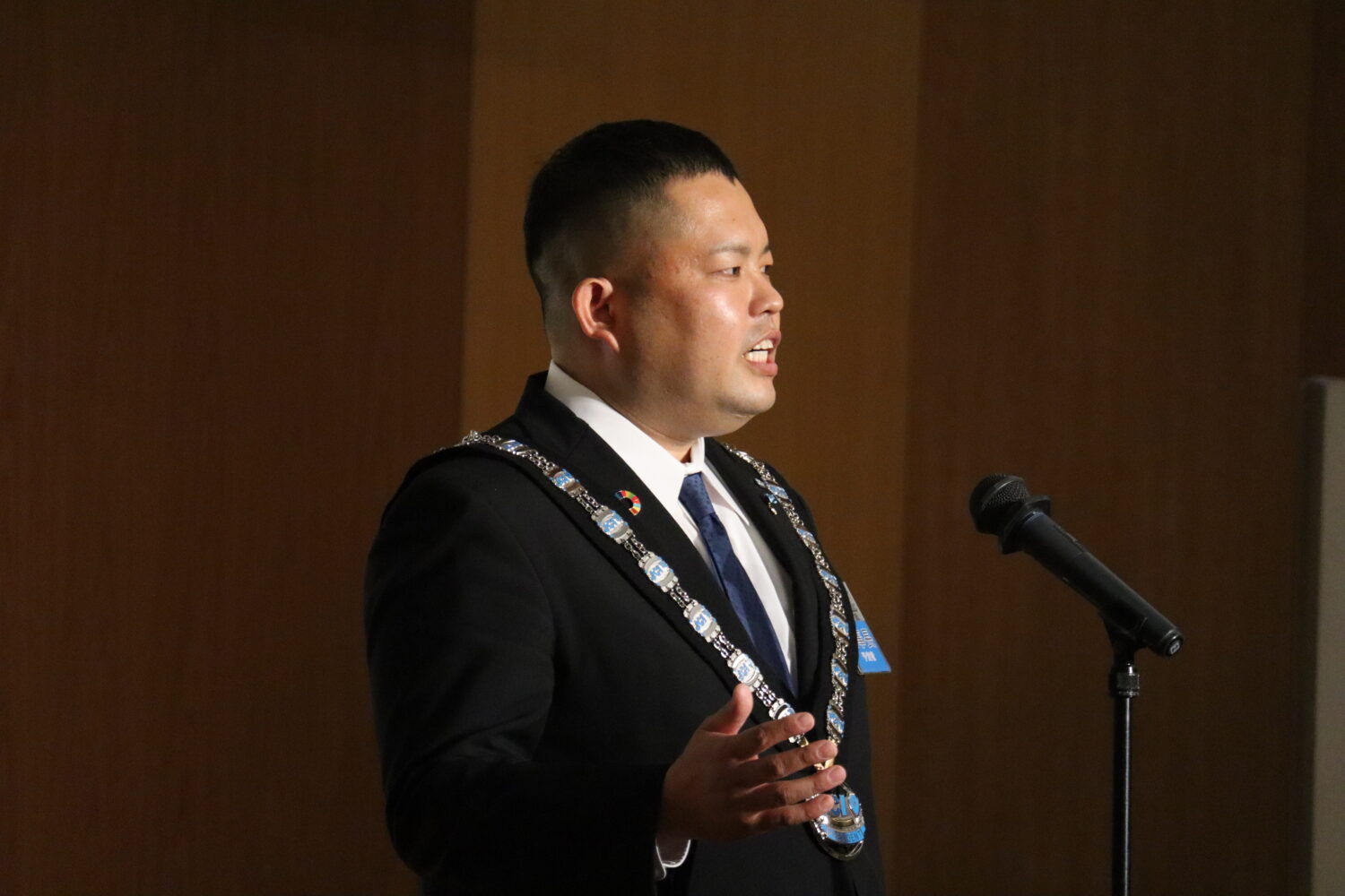 プレジデンシャルリリースの伝達式が行われ、歴代理事長の皆様に介添えを頂き、当年度理事長、島田宗輔君より2023年度理事長予定者の徳岡旭君へプレジデンシャルリリースの伝達が行われました。