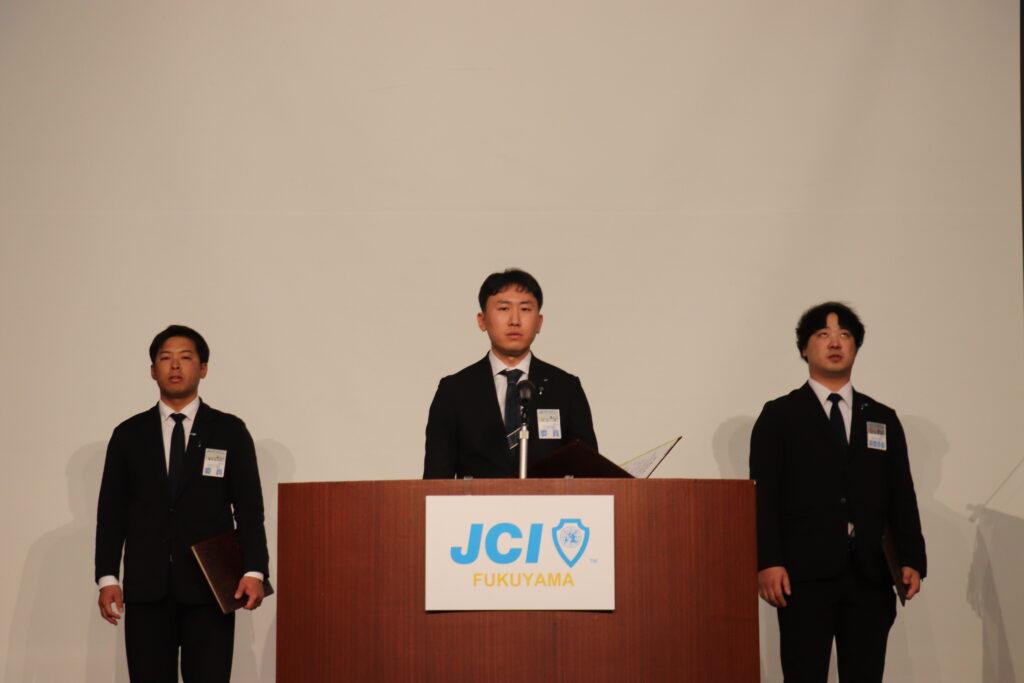 冒頭のセレモニーは、We Believe 総務セクレタリー委員会の掛谷利雄副委員長、橋本裕太郎委員、井上想委員が担当し、例会担当の総務委員会として例会の幕を開けました。
