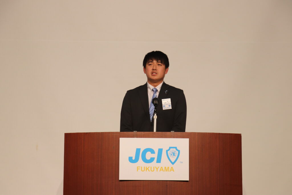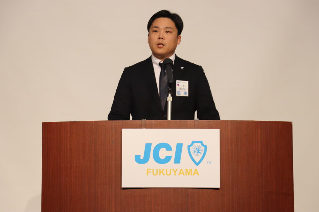 続く理事長挨拶では、長鋪毅輔理事長が「青年会議所で活動する魅力」をテーマに、自身が青年会議所での活動を通じて、福山市を自分が育ったまちではなく自分を育ててくれたまちだという実感を持つようになったことを語り、少しずつでも積極的に活動していこうと思う瞬間があれば、それが十分なスタートだから、その気持ちを大事にしてほしいと語りました。