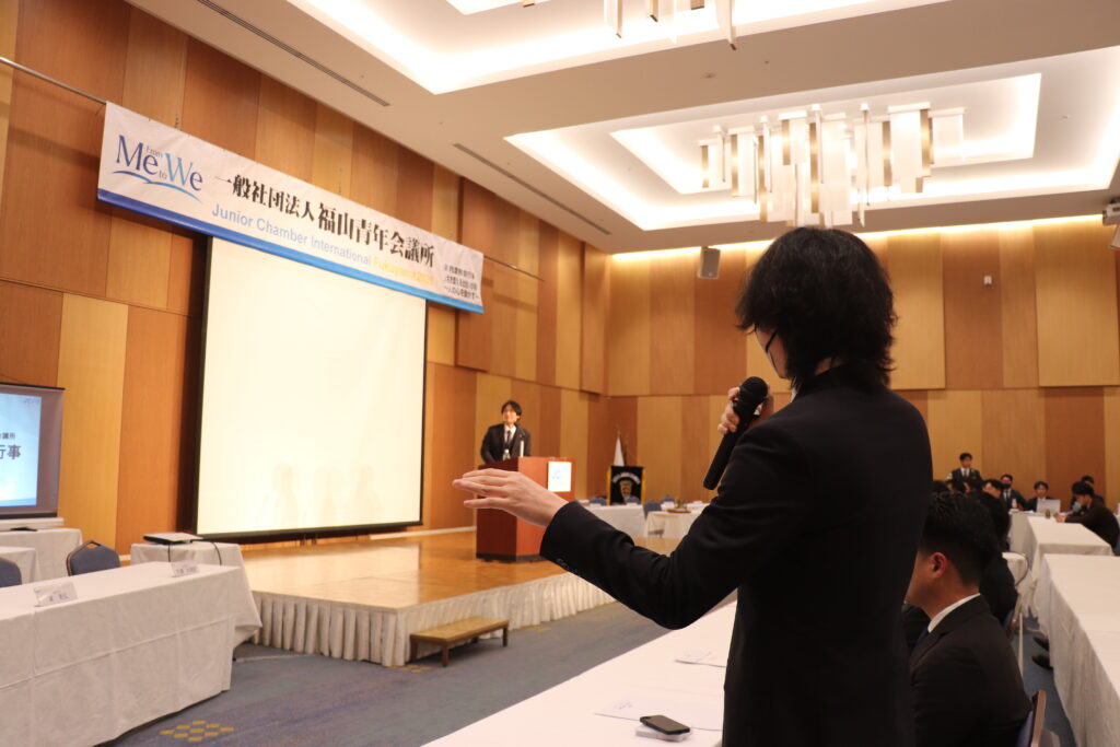 福山青年会議所では、2月2日(月)に2月度例会を開催いたしました。メンバーに加え、府中JCの皆様や、仮入会者の皆様も参加し、100人に迫る参加者で会場はとても賑やかな場となりました。