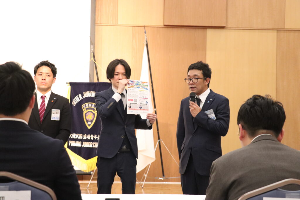 3分間スピーチでは、We Believe 総務セクレタリー委員会の渡邊大次郎幹事が登壇し、「先を歩く」をテーマに青年会議所での半年間の経験を振り返り、先輩方の行動から自分に足りない部分を実感したこと、責任感のある立場を任されたことで、自分の行動が周りの動きを変えることに気づき、物事の先送りをやめ、3歩先を見据えた行動をするようになったことを語り、この1年間、無理をせず常に全力で行動し、終わる頃には自分で成長できたと思えるように過ごしていくことを宣言しました。