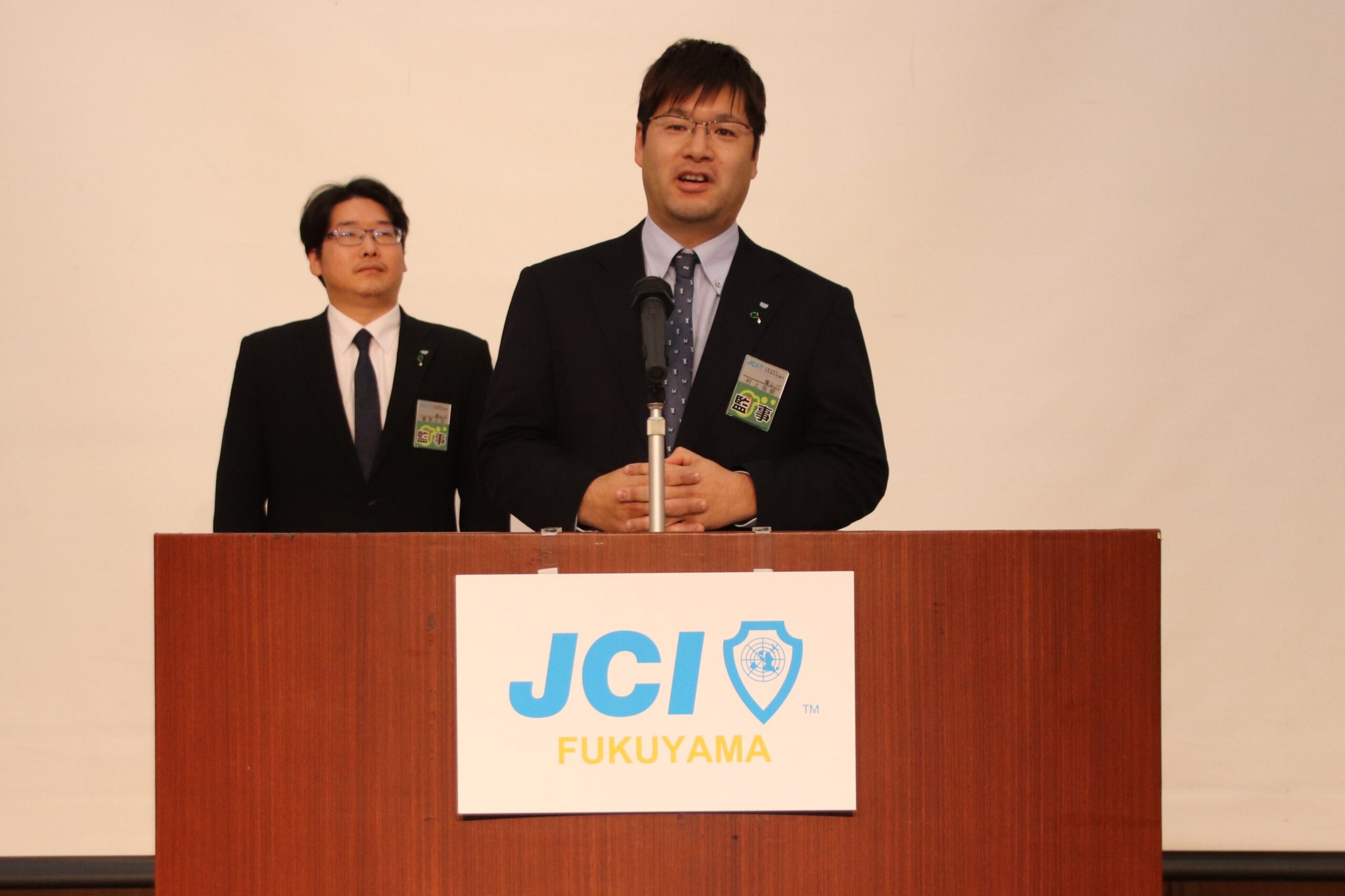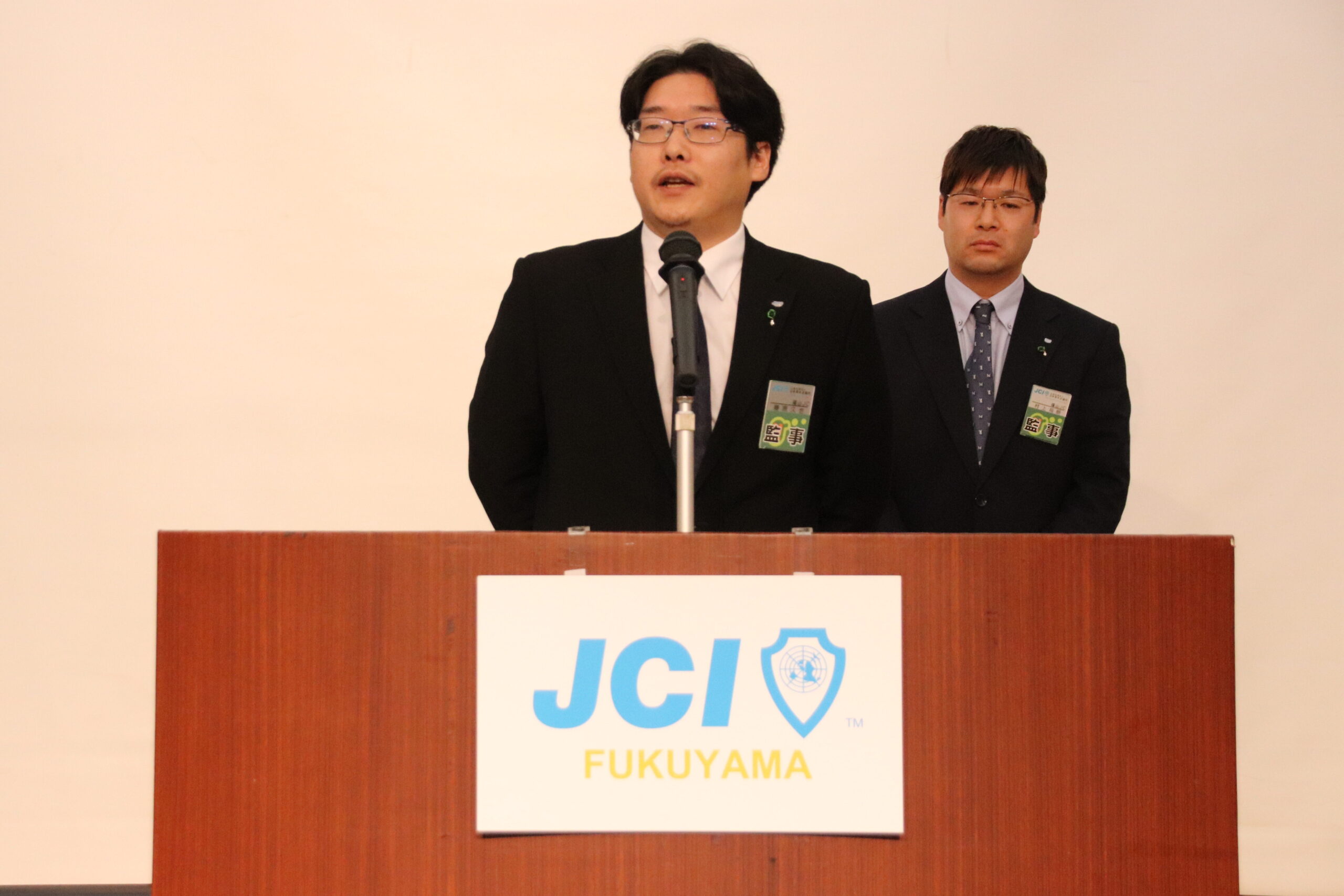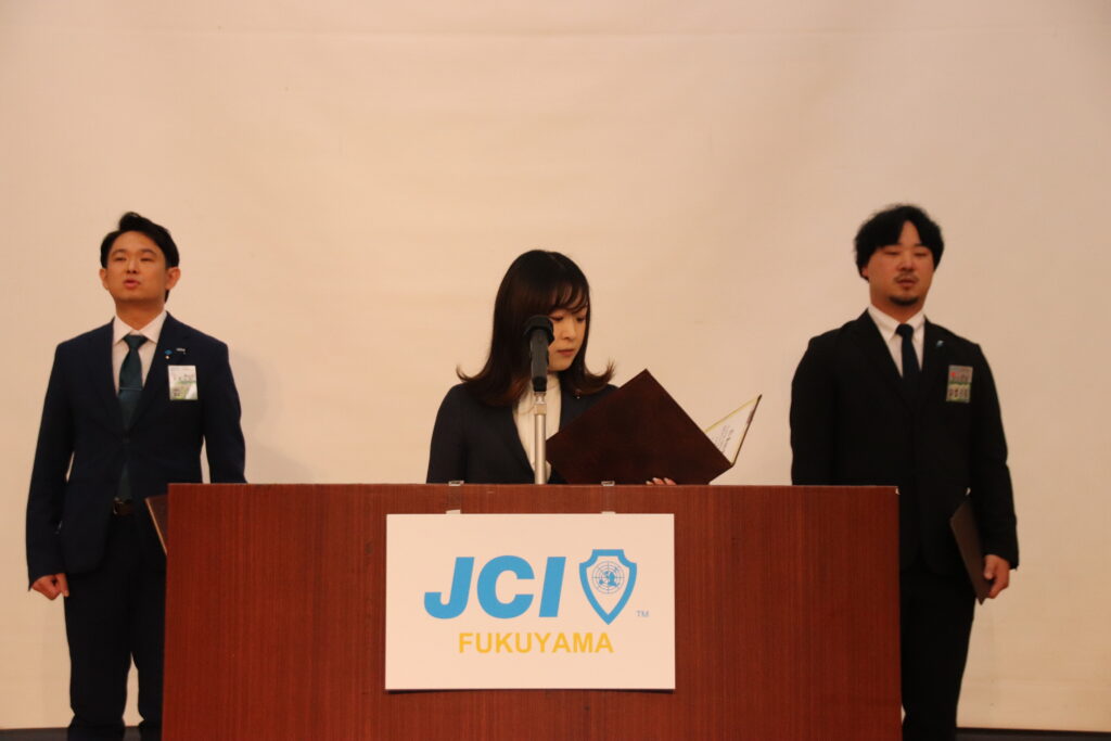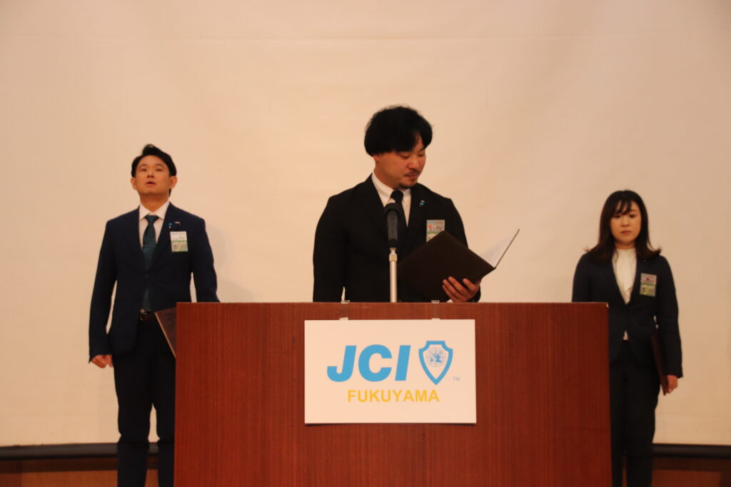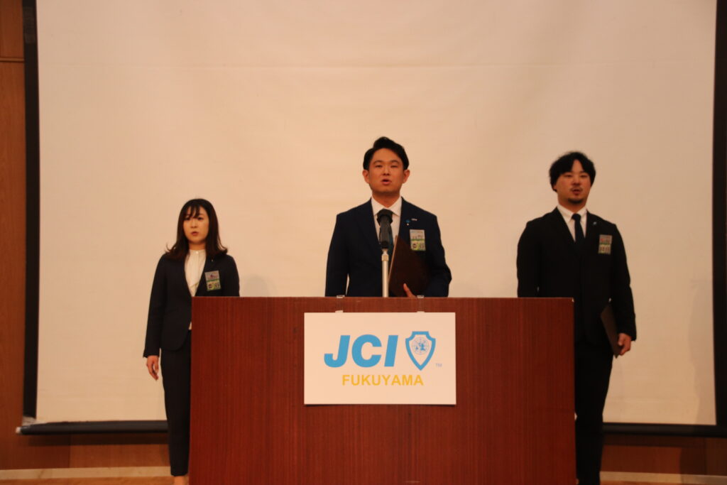 福山青年会議所の例会で恒例のセレモニーは、魅力あふれるまち想造委員会の3人により行われました。