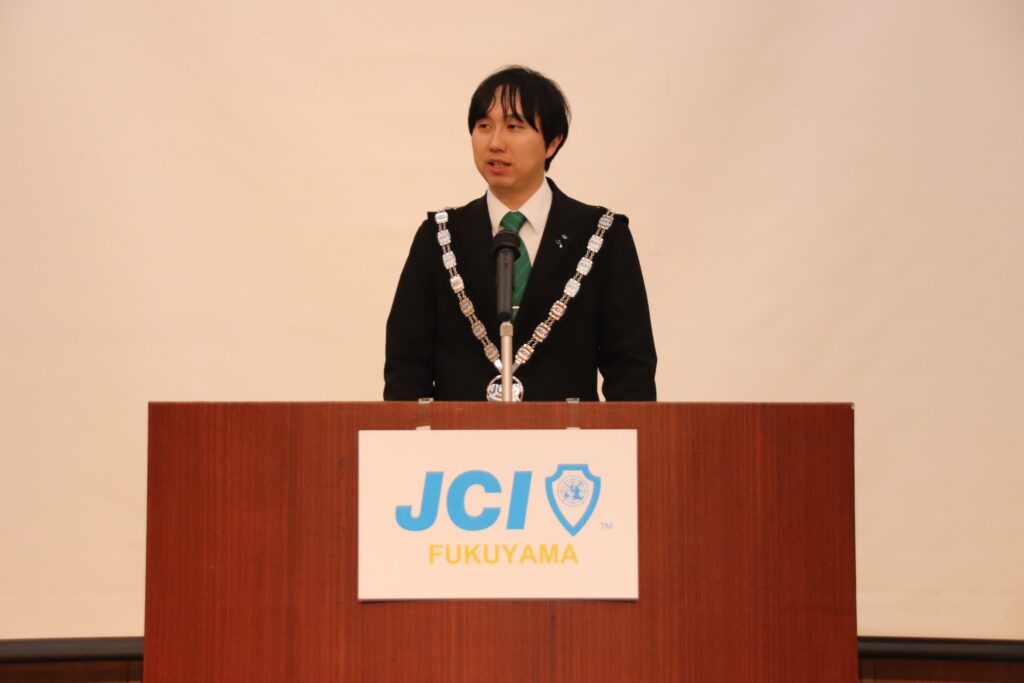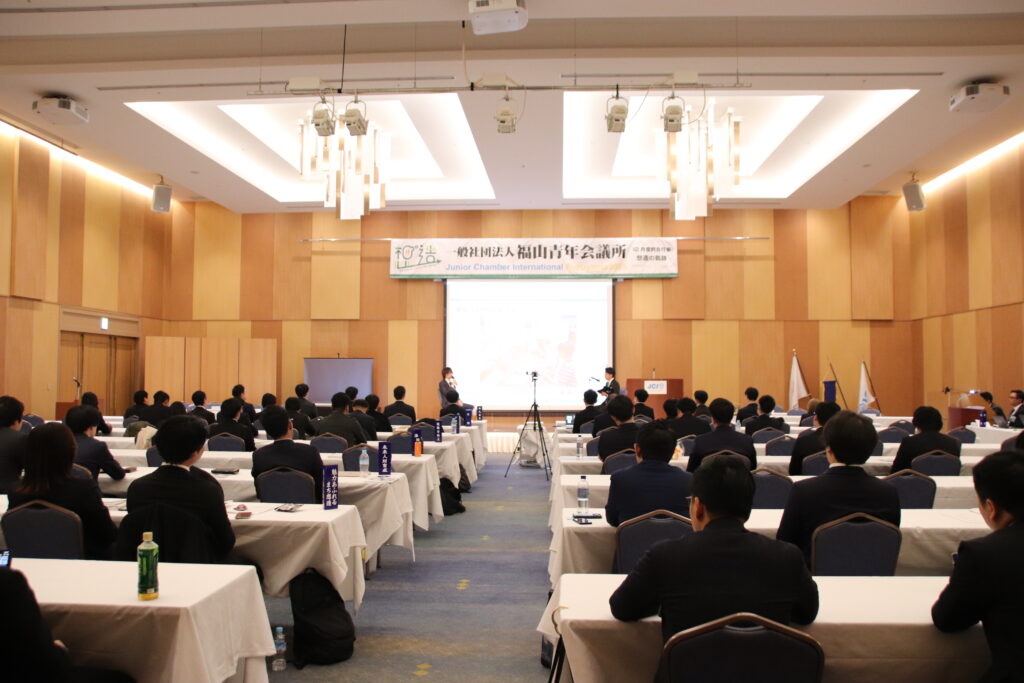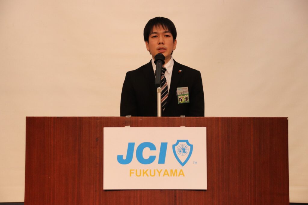 3分間スピーチでは魅力あふれるまち想造委員会 卜部 将平 幹事が登壇し、2025年福山青年会議所のテーマである「想造」のテーマのもとスピーチを行いました。自身の会社が、リサイクルという言葉も無かったような時代に牡蠣殻の肥料への再利用をはじめたことを例に挙げつつ、新しい何かは人の想像と、それを元に一歩踏み出した創造によって作られるということを語りました。