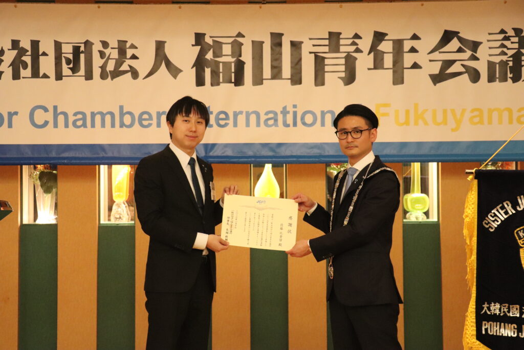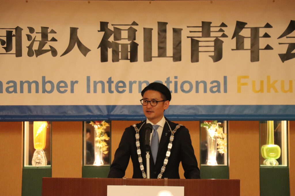 さらに、出向者の紹介が行われ、長鋪理事長から激励の言葉が送られました。出向とは、福山青年会議所に所属しながら、日本青年会議所や広島ブロック協議会といった他の学びの場でも役割を担うもので、責任は大きいものの、自己成長の機会として多くのメンバーが挑戦しています。