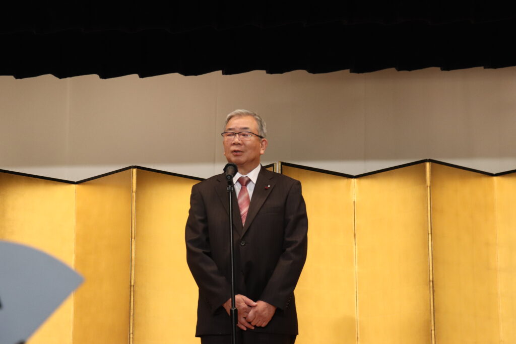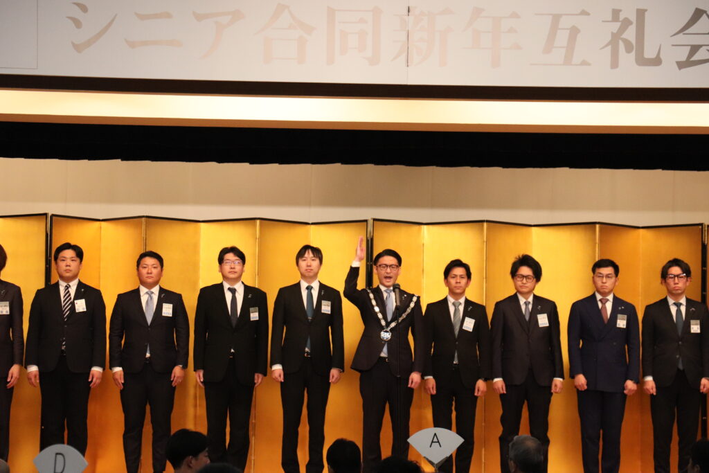 冒頭では、本年度の福山青年会議所 理事会構成メンバーが壇上に登壇し、ご来場の皆様へ新年のご挨拶を申し上げました。続いて、共同開催者である福山JCシニアクラブ会長の小川秀久先輩より、ご挨拶を頂戴しました。