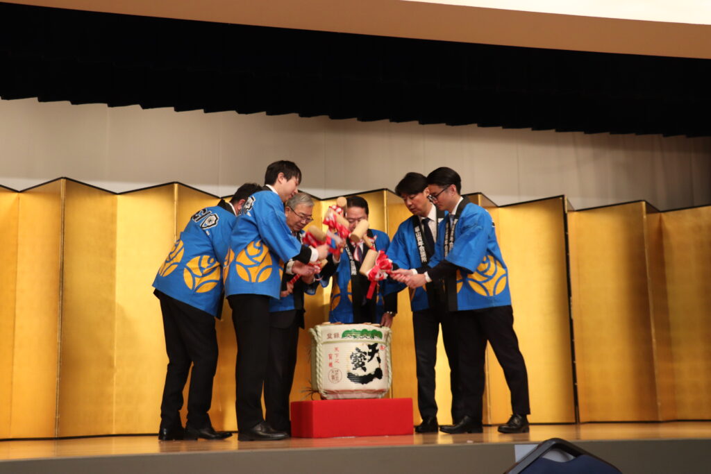 その後、ご来賓のお二人に加え、シニアクラブ会長、代表幹事、昨年度理事長、本年度理事長の6名による鏡開きが行われ、会場には新たな一年の幕開けを告げる木槌の音が力強く響き渡りました。